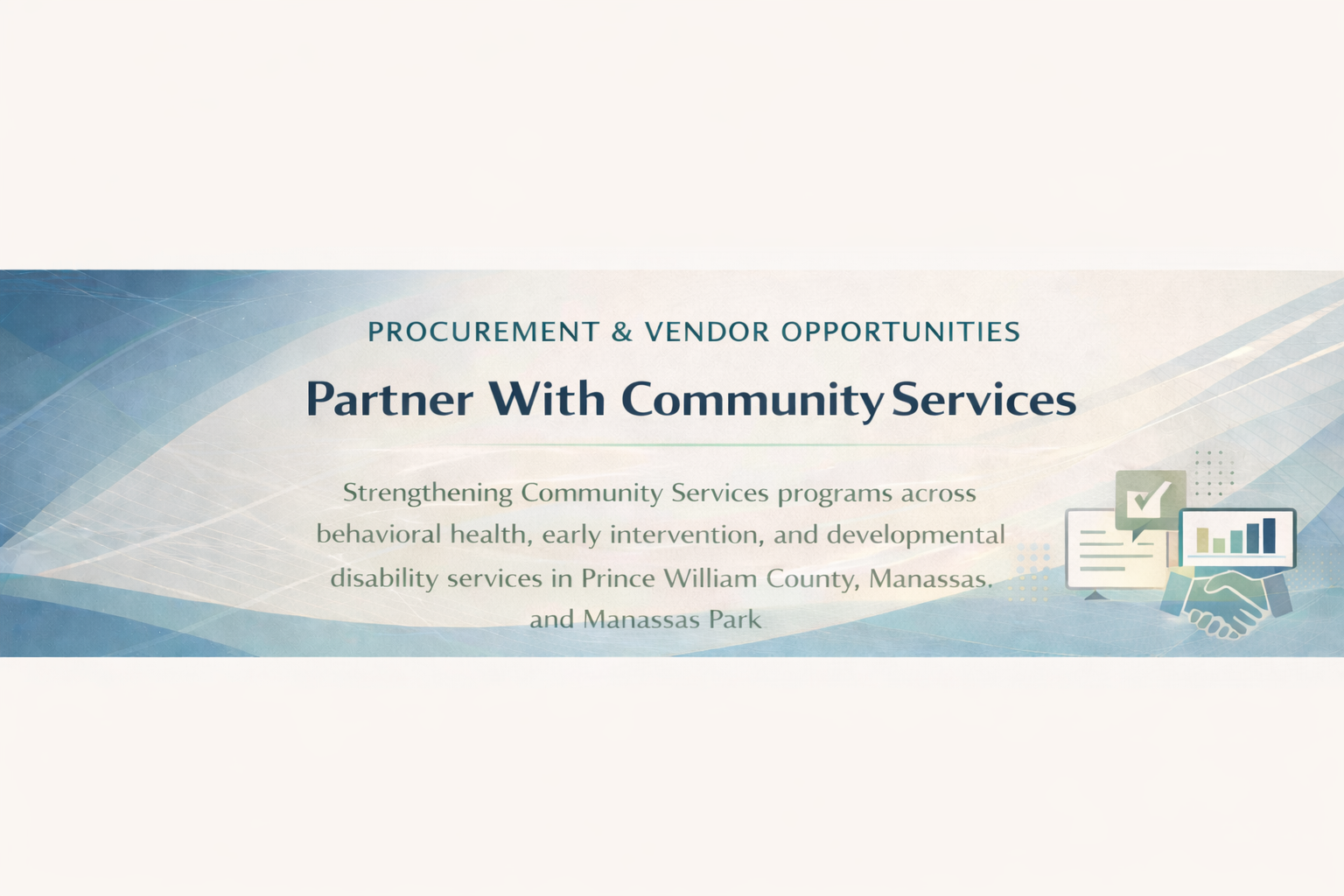 Prince William County Community Services partners with vendors and community organizations to expand access to behavioral health, developmental disability, crisis response, and early intervention services. We welcome qualified partners aligned with County priorities.